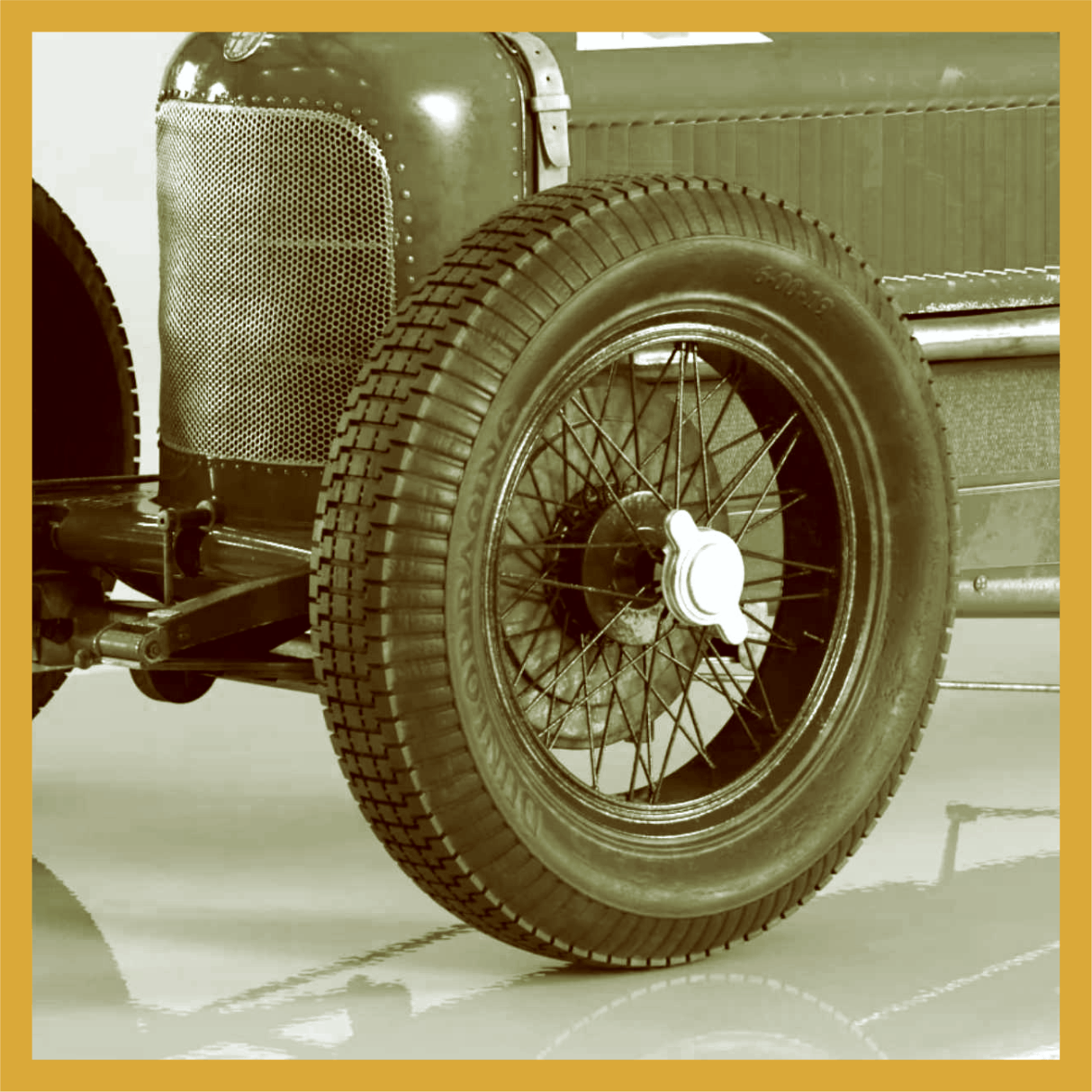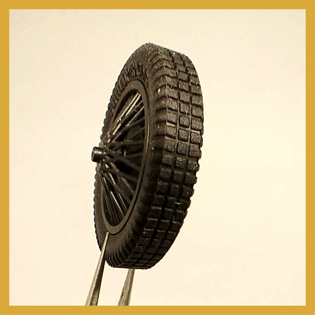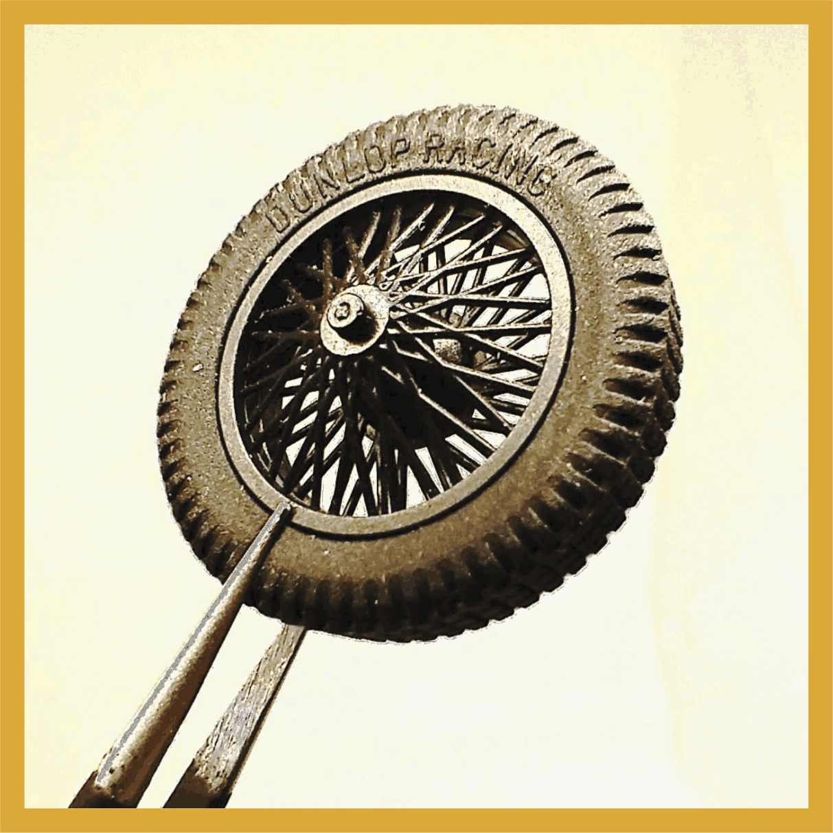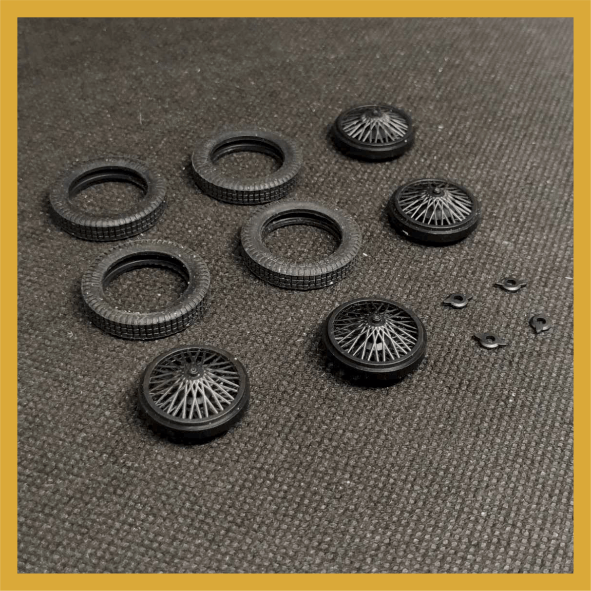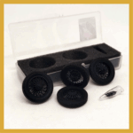 Set compuesto por 4 cubiertas  DUNLOP RACING + 4 llantas inyectadas en PP. de alambre. Logo en sobre relieve en ambas caras . Adaptable a coches de años 20 y 30  -Diám ruedas montadas: 24,5 mm tras. Eje 2 mm- adaptable a 3/32 /